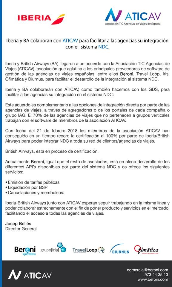 En la imatge que us vam mostrar a continuació, podeu veure el document acreditatiu en què Ibèria i British col·laboren amb Beroni Informàtica i ATICAV (Associació TIC d’Agències de Viatges).