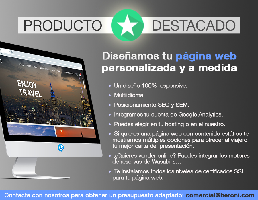 En Beroni diseñamos y programamos tu página web en función de tus necesidades, contando con la tecnología más avanzada que te dará la profesionalidad que necesitas para tener una buena presencia en internet y destacar entre tus competidores. Tanto si eres una agencia de viajes emisora, como receptiva, mayorista o de grupos, somos especialistas en ofrecerte una solución adaptada a tus necesidades.
